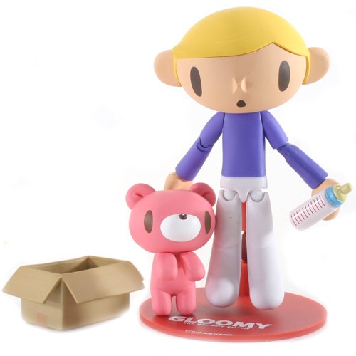 A Revoltech-brand figure, featuring articulation, from the Gloomy Bear line of figures. Gloomy Bear includes a muzzle and removable fake blood, while Pity includes a baby gloomy bear, bottle and a cardboard box. This includes a stand. Packaged in a color box packaging, with Japanese text. The figure stands about 4.5" (11 cm) in height.