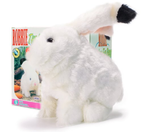 Robbie is a sweet little bunny rabbit that loves to play. Switch the bunny on and and he hops forward, sits to wiggle his little pink nose and raises his big floppy ears as if he hears something. Action is then repeated. Robbie is covered in soft, fuzzy white fur and has adorable floppy ears. Approx. 9 inches (23 cm) tall with ears raised. Runs on (2) AA batteries (not included). Ages 3 years and over.