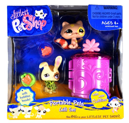 Hasbro Year 2007 Littlest Pet Shop "Cuddliest" Series Portable Pets Bobble Head Figure Box Gift Set - Brown Raccoon (#583) and Yellow Bunny Rabbit (#582) Plus Flower Collar, Bowl with "Carrots" and Cozy Carrier (65134)